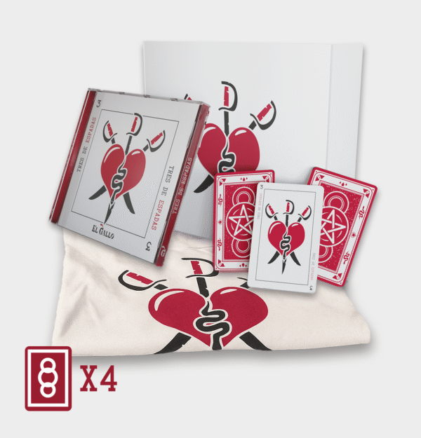 El pack con todo el merchandising de Tres de Espadas, incluye:
